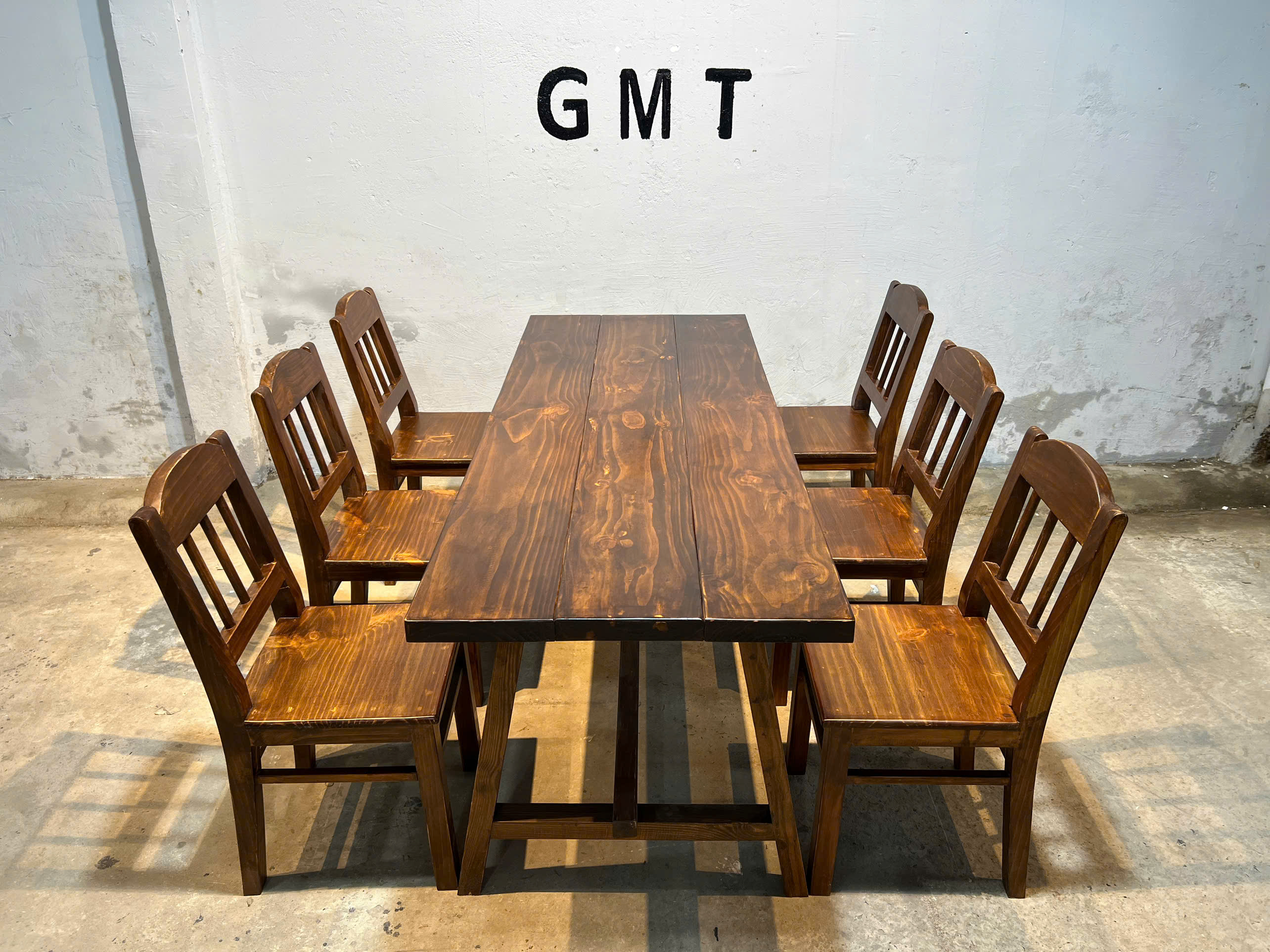 Bộ bàn ghế gỗ thông 1m6 + 6 ghế tựa G8 – Sang trọng, chắc chắn cho quán ăn